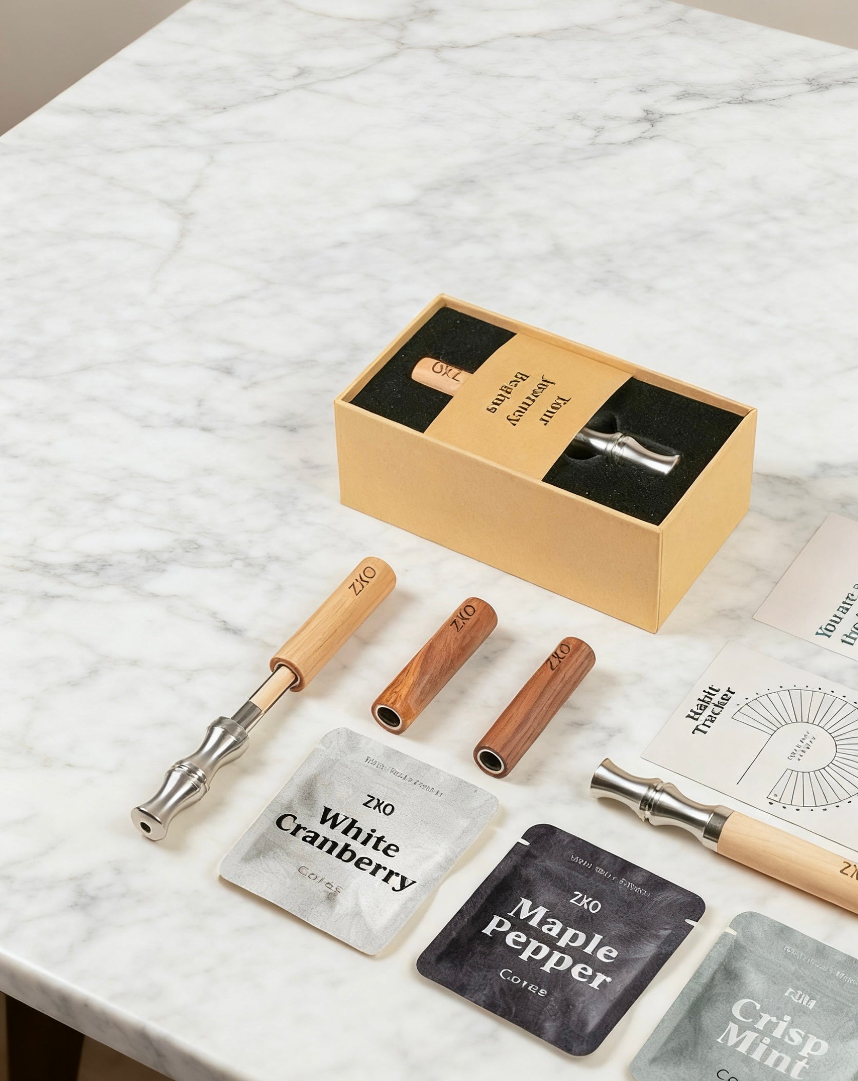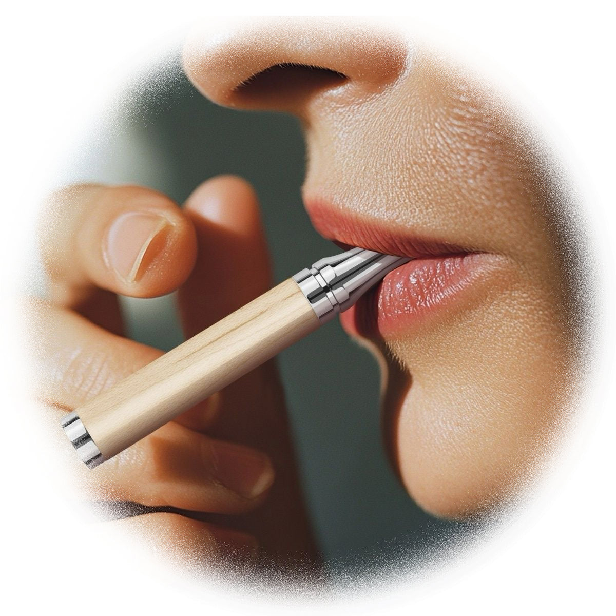 A: It uses a natural plant essential oil filter, a solid wood body, and a stainless steel mouthpiece to freshen your mouth, relieve throat irritation, and help curb cigarette cravings.