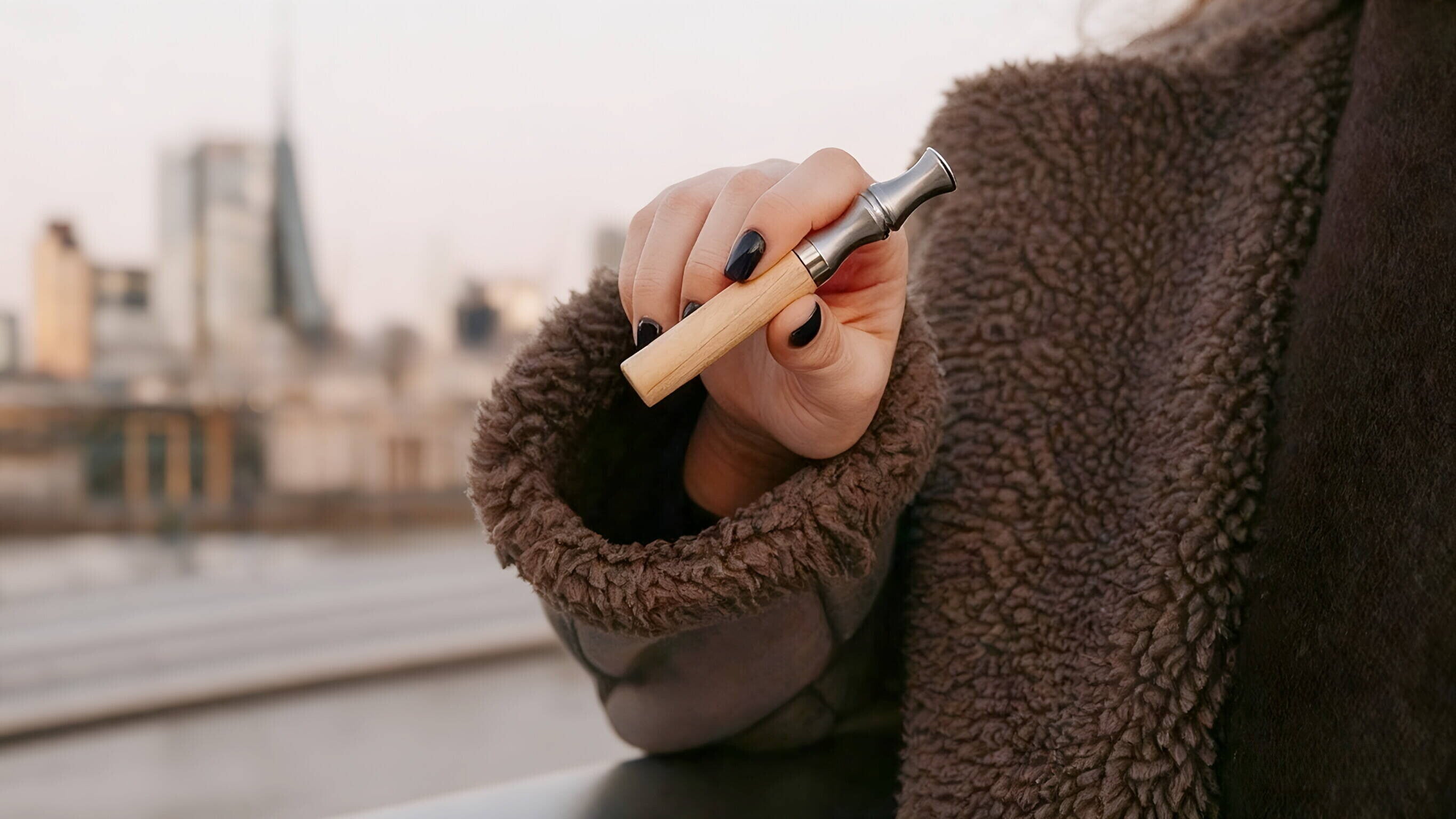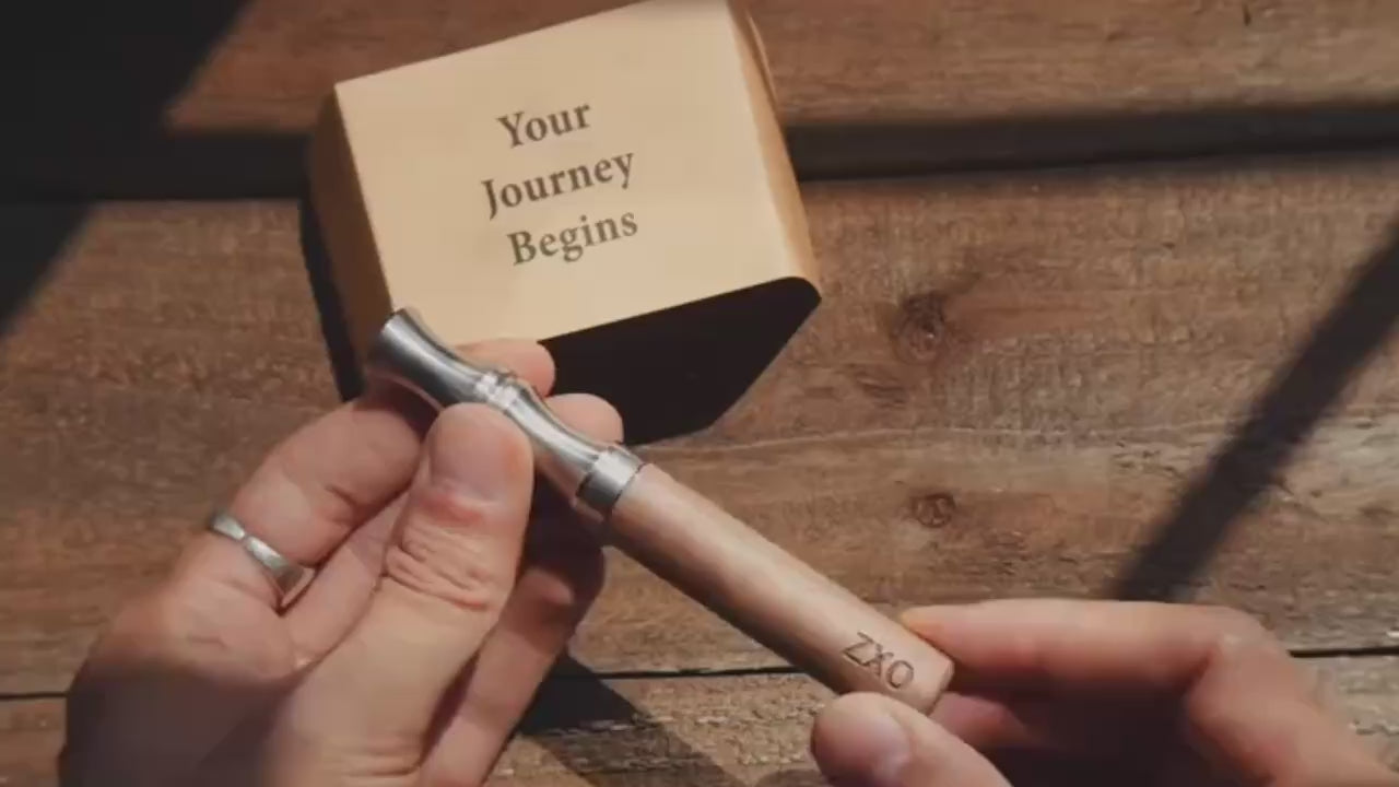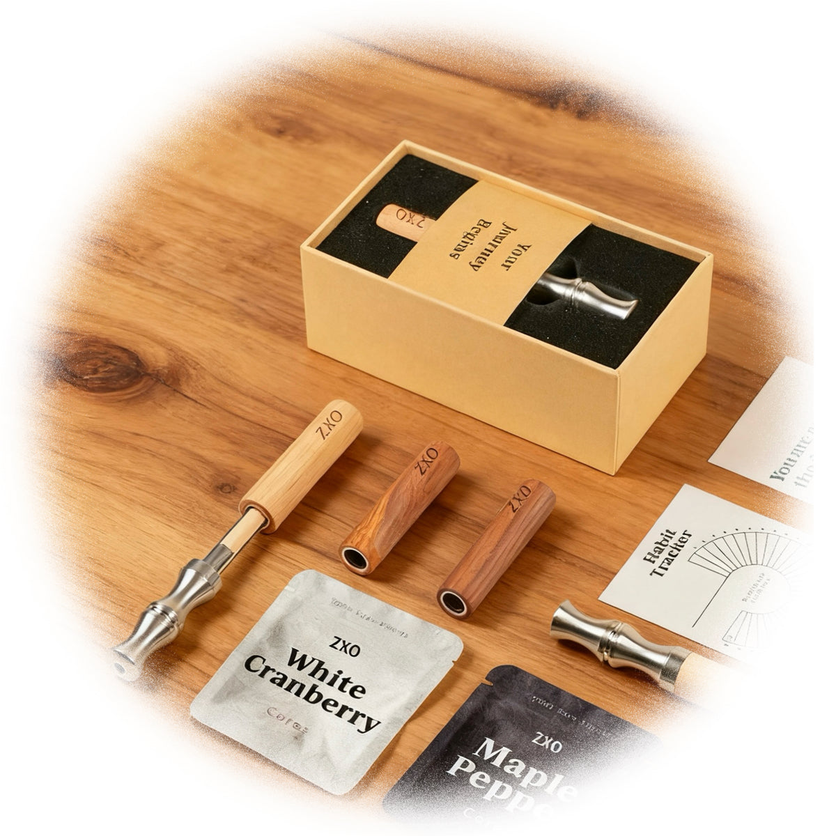 A: It uses a natural plant essential oil filter, a solid wood body, and a stainless steel mouthpiece to freshen your mouth, relieve throat irritation, and help curb cigarette cravings.